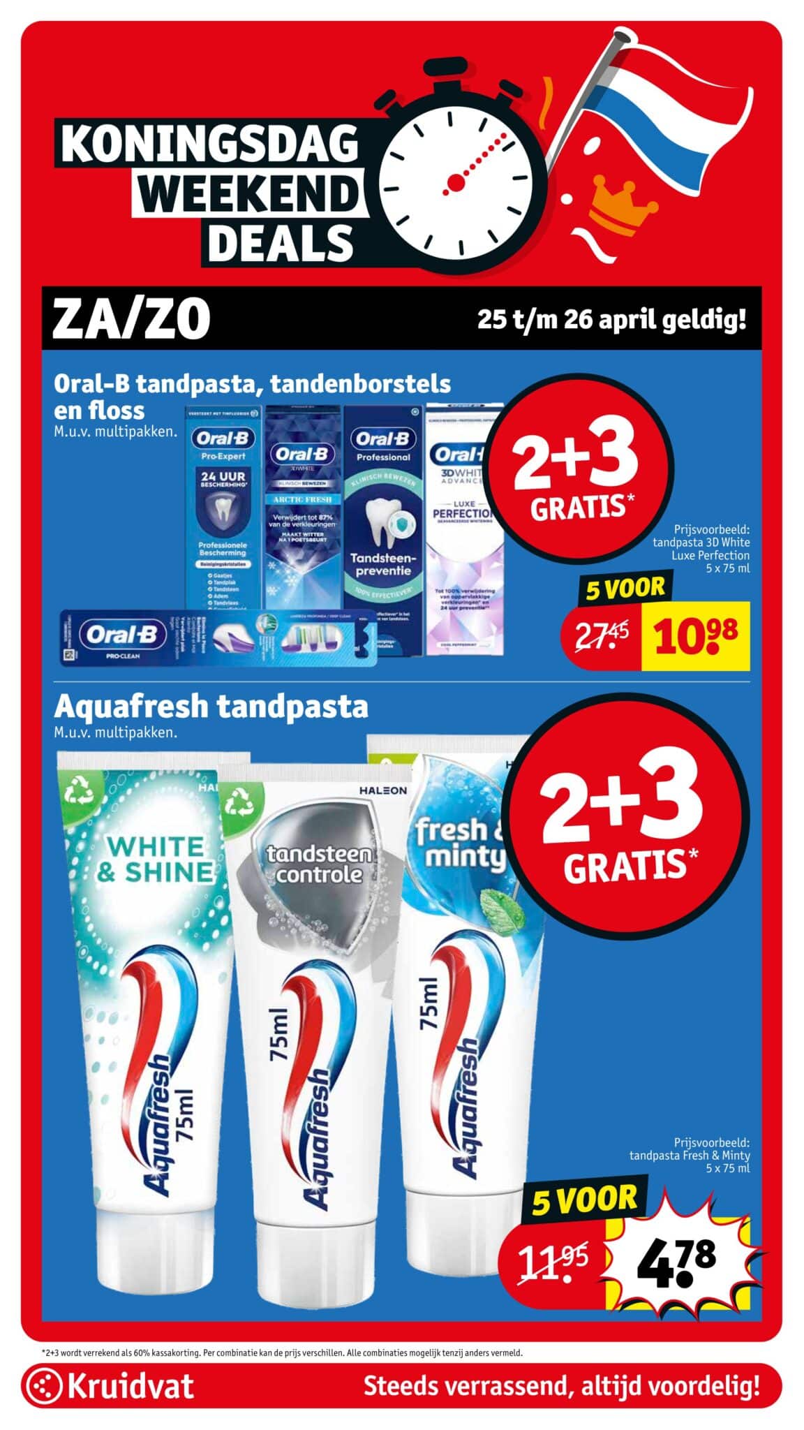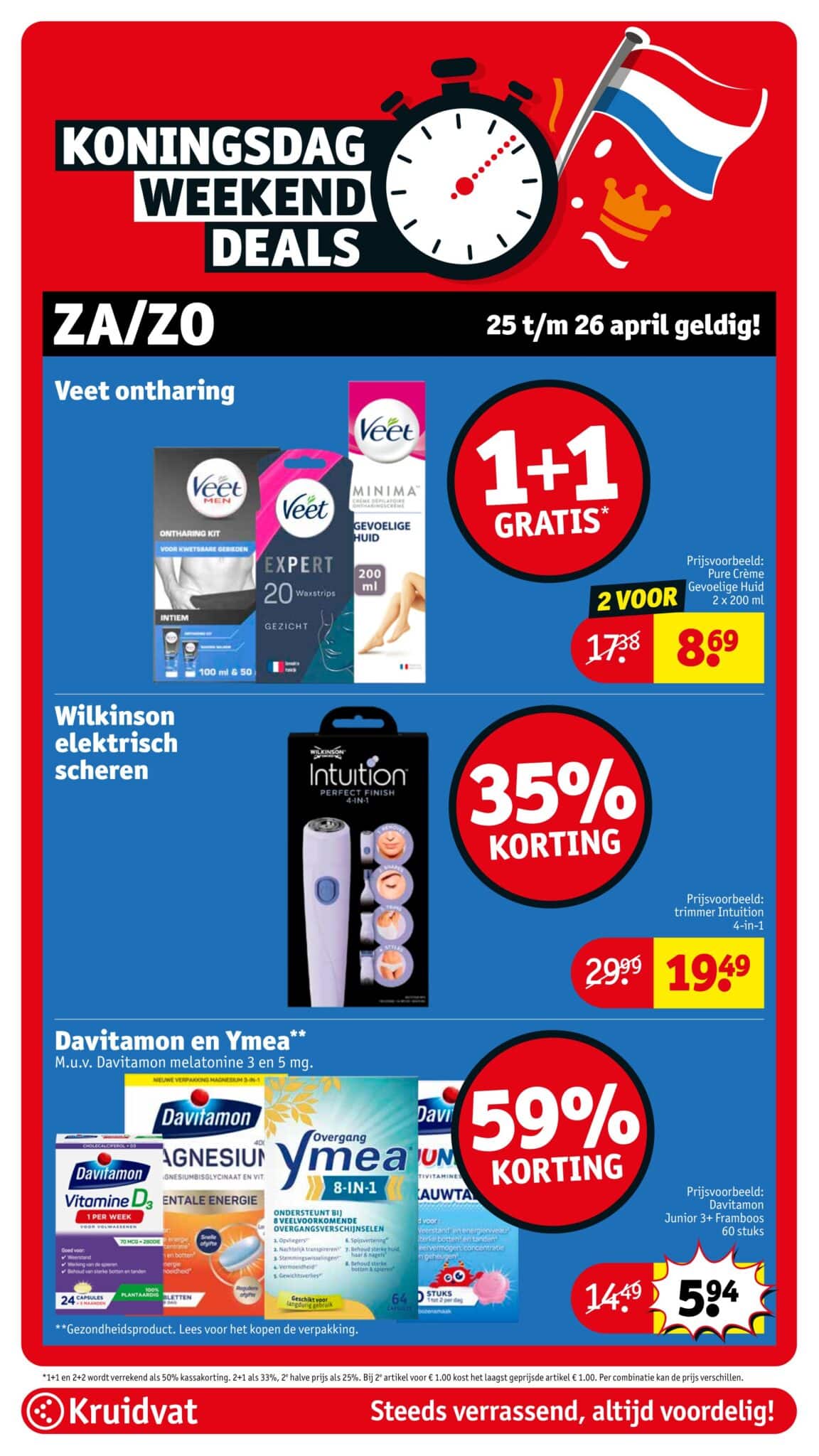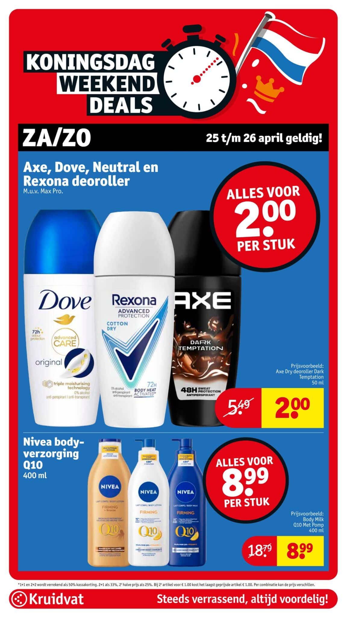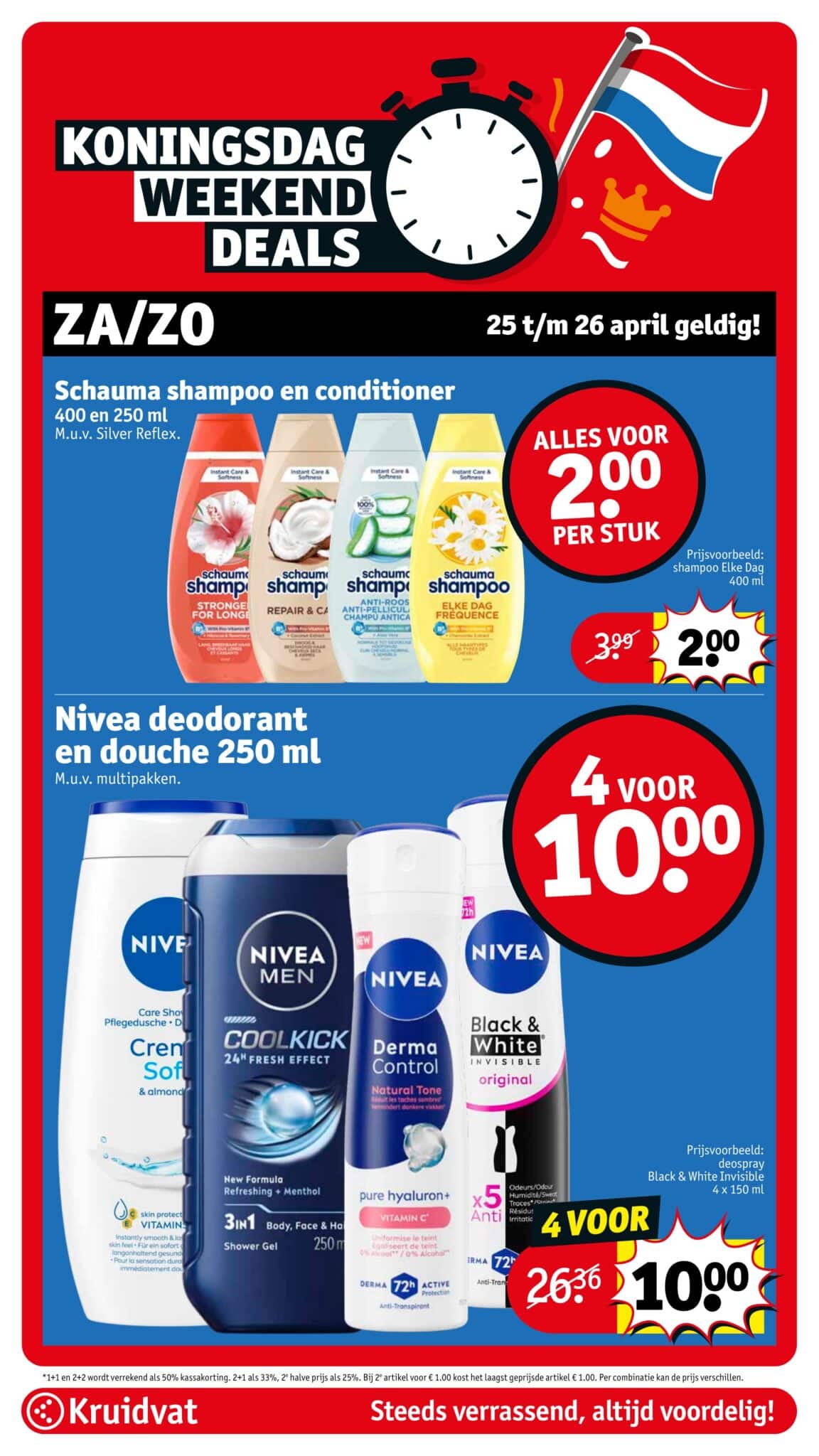 Kruidvat actuele folder geldig van 21.04 tot en met 26.04.2026. Bekijk alle acties en aanbiedingen van deze week in de online Kruidvat folder. In het Kruidvat koop je alles voor persoonlijke verzorging en schoonheid aan scherpe prijzen. Daarnaast is er ook een ruim assortiment aan andere nuttige huishoudproducten en entertainment zoals goedkope boeken en dvd’s. Bestel voor acht uur ‘s avonds en ontvang je bestelling de volgende dag.